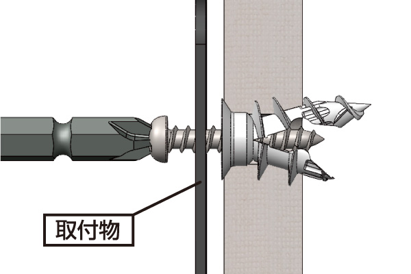 ボードに対して鋭い先端で確実に位置決めができ、ねじ込みも楽に進みます。開脚時にはパキっと音でお知らせするので見えない壁裏でも施工の確実性を確認できます。